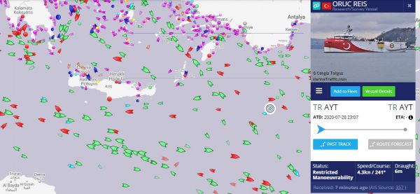 Το Oruc Reis κινείται πλέον νοτιοδυτικά, με ταχύτητα 4 κόμβων περίπου, με τα δυο βοηθητικά του σκάφη Ataman και Cengiz Han και συνοδευόμενο από ισχυρή ναυτική δύναμη τουρκικών πολεμικών πλοίων.