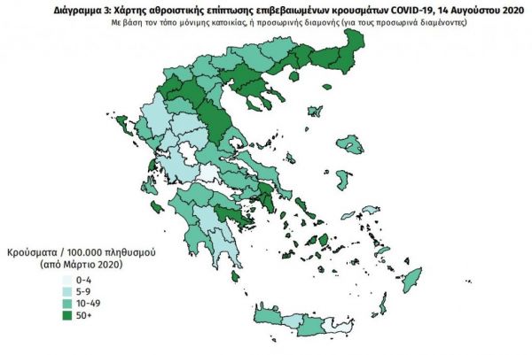 Ο χάρτης αποτυπώνει τη γεωγραφική κατανομή των συνολικών κρουσμάτων COVID-19 (από την αρχή της επιδημίας) ανά Περιφερειακή Ενότητα της χώρας, με βάση την δηλωθείσα διεύθυνση μόνιμης κατοικίας του ασθενούς, ή τη διεύθυνση προσωρινής διαμονής για τους τουρίστες και άλλους προσωρινά διαμένοντες στην Ελλάδα. Συμπεριλαμβάνονται τόσο κρούσματα με ιστορικό ταξιδίου (“εισαγόμενα”) όσο και κρούσματα με πιθανή εγχώρια μετάδοση.