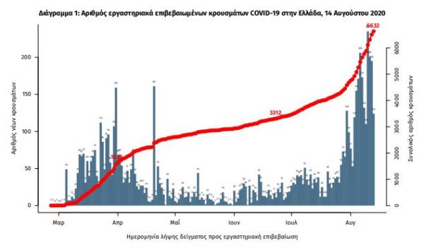 Ο ΕΟΔΥ ανακοίνωσε σήμερα 254 νέα κρούσματα του νέου ιού στη χώρα, εκ των οποίων τα 20 εντοπίστηκαν κατόπιν ελέγχων στις πύλες εισόδου της χώρας. Ο συνολικός αριθμός των κρουσμάτων είναι 6632, εκ των οποίων το 55.0% αφορά άνδρες.