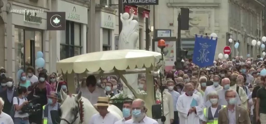 Περίπου 2.000 πιστοί πήραν μέρος χθες, παραμονή της Κοίμησης της Θεοτόκου, στη λιτανεία για την Παρθένο Μαρία προς τον Καθεδρικό Ναό της Νότρ Νταμ, που καταστράφηκε από τη μεγάλη πυρκαγιά τον Απρίλιο του 2019.