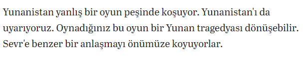 Συγκεκριμένα, ο εκπρόσωπος του ΑΚP, σε ένα ακόμα παραλήρημα είπε: «Η Ελλάδα παίζει λάθος το παιχνίδι. Κάνει παιχνίδια που ξεπερνούν το μέγεθός της. Προειδοποιούμε την Ελλάδα. Αυτό το παιχνίδι που παίζετε, μπορεί να μετατραπεί σε ελληνική τραγωδία. Δεν θα είμαστε εμείς υπεύθυνοι. Δεν θα επιτρέψουμε να παίζετε ελληνικό θέατρο μέσω της διπλωματίας. Θέλουν να πετύχουν κάτι ανάλογο με τη Συνθήκη των Σεβρών» φέρεται να είπε ο Τσελίκ.