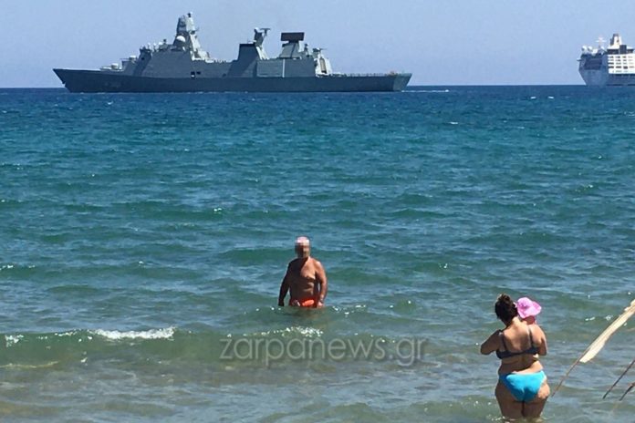 Η φρεγάτα και το κρουαζιερόπλοιο ήταν αρόδο και στην ακτή οι λουόμενοι, συνθέτοντας ένα όχι και τόσο συνηθισμένο – και καθόλου ευχάριστο – σκηνικό.