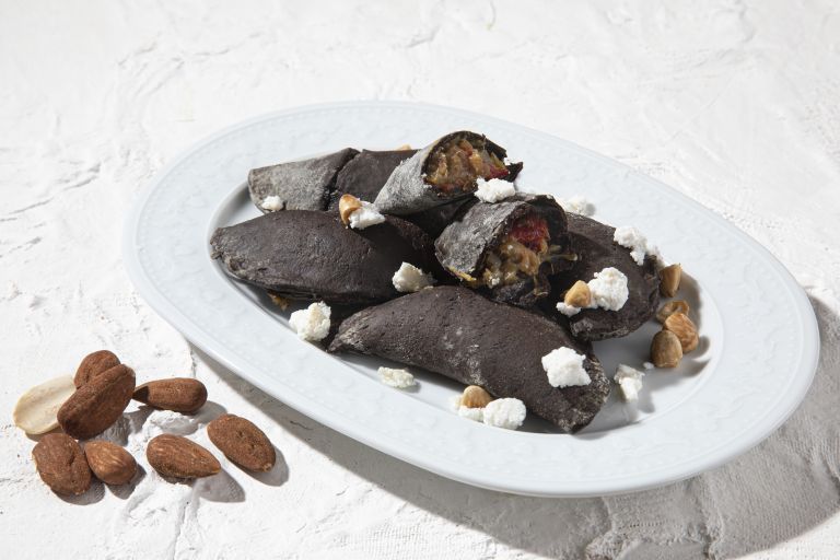Το χαρούπι και η ξινομυζήθρα δίνουν ταυτότητα στα νόστιμα πιτάκια με πολτό από καπνιστές μελιτζάνες.