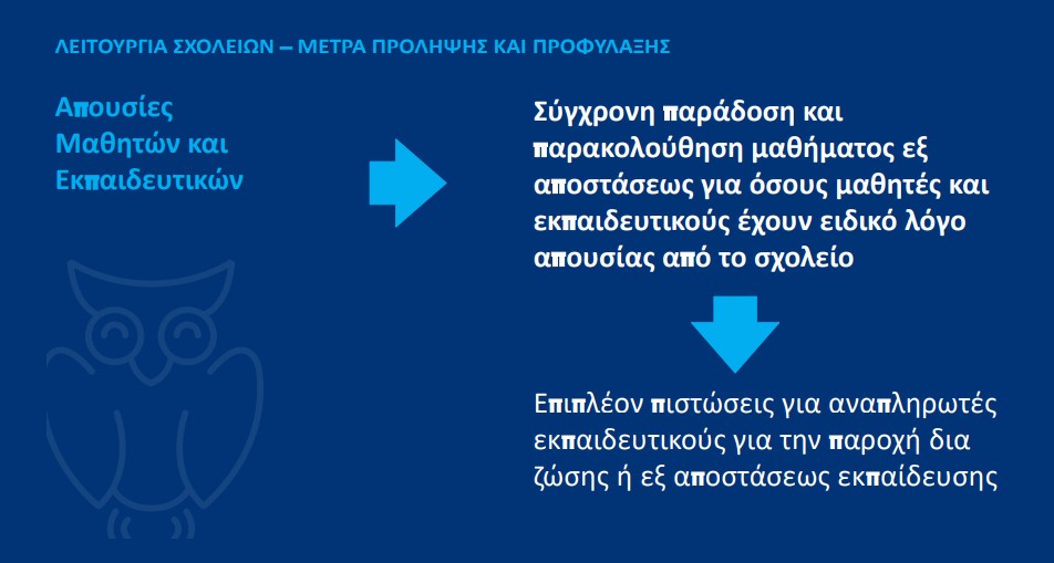 Σε περίπτωση αναστολής της λειτουργίας ενός τμήματος ή μίας σχολικής μονάδας, η εκπαιδευτική διαδικασία θα πραγματοποιείται μέσω σύγχρονης τηλεκπαίδευσης.