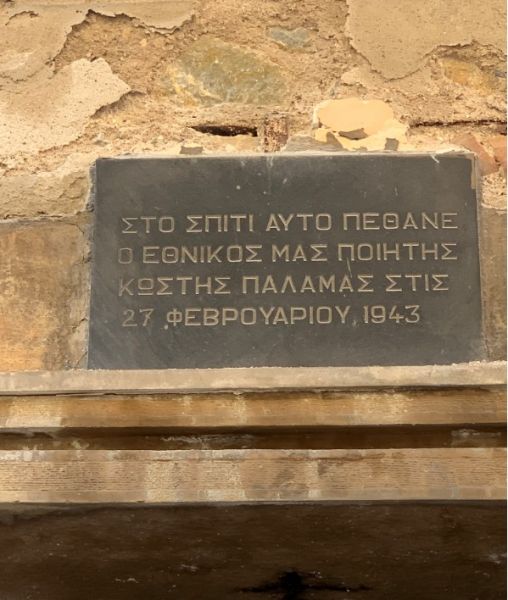 Μια πλάκα πάνω από την κύρια είσοδο του σπιτιού αναγράφει: «Στο σπίτι αυτό πέθανε ο εθνικός μας ποιητής Κωστής Παλαμάς στις 27 Φεβρουαρίου 1943».