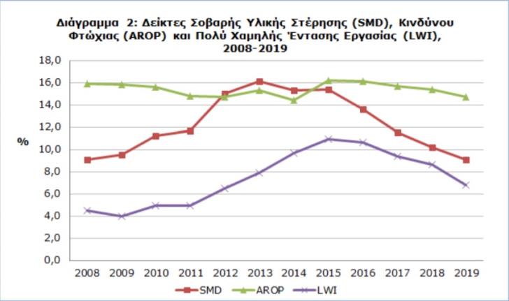 Πιο συγκεκριμένα, 22,3% του πληθυσμού ζούσε σε νοικοκυριά με διαθέσιμο εισόδημα κάτω από το όριο της φτώχειας ή ζούσε σε νοικοκυριά με σοβαρή υλική στέρηση ή ζούσε σε νοικοκυριά με πολύ χαμηλό δείκτη έντασης εργασίας.