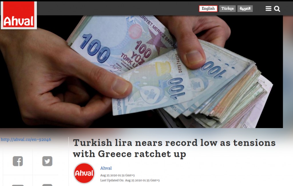 «Η τουρκική λίρα προσέγγισε την Τρίτη το ιστορικό χαμηλό της έναντι του δολαρίου καθώς οι πολιτικές και στρατιωτικές εντάσεις με τη γειτονική Ελλάδα στη Μεσόγειο εντάθηκαν» σχολιάζει την Τρίτη η τουρκική ιστοσελίδα Ahval.