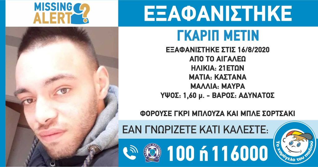 Εξαφανίστηκε στο Αιγάλεω ο Γκαρίπ Μετίν, 21 ετών, και σύμφωνα με το Χαμόγελο του Παιδιού ενδέχεται να διατρέχει κίνδυνο.