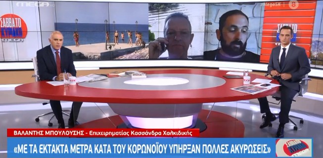 Από την πλευρά του ο κ. Μπουλούσης υποστήριξε πως μετά τα δεύτερα μέτρα στη Χαλκιδική, τα πράγματα έγιναν ακόμα πιο δύσκολα και πως πολλοί διέκοψαν τις διακοπές τους κι έφυγαν, ενώ πολλοί άλλοι τις ακύρωσαν.