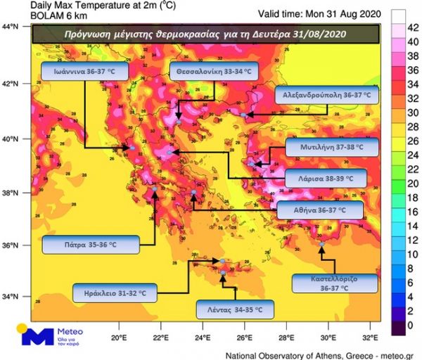 Εκτιμώμενη μέγιστη θερμοκρασία για τη Δευτέρα 31/08/2020, σύμφωνα με το αριθμητικό μοντέλου καιρού του Εθνικού Αστεροσκοπείου Αθηνών / Meteo.gr. Στο χάρτη, επίσης, εμφανίζονται οι μέγιστες θερμοκρασίες σε επιλεγμένες πόλεις
