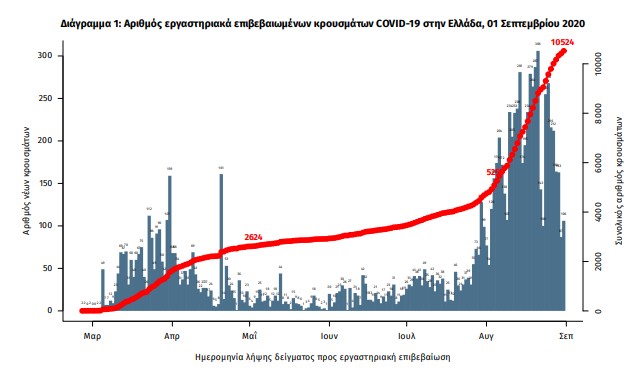 Έτσι, ο συνολικός αριθμός των κρουσμάτων είναι 10.524, εκ των οποίων το 55.5% άνδρες, ενώ 2.112 (20.1%) θεωρούνται σχετιζόμενα με ταξίδι από το εξωτερικό και 4.710 (44.8%) είναι σχετιζόμενα με ήδη γνωστό κρούσμα.