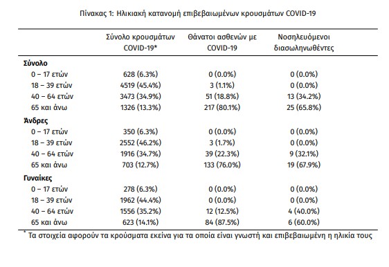 Η μέση ηλικία των κρουσμάτων είναι 38 έτη (εύρος 0 έως 102 ετών), ενώ η μέση ηλικία των θανάτων είναι 78 έτη (εύρος 35 έως 102 ετών). Η ηλικιακή κατανομή των (α) συνολικών κρουσμάτων, (β) των περιστατικών που κατέληξαν σε θάνατο και (γ) των ασθενών που νοσηλεύονται διασωληνωμένοι, είναι η ακόλουθη: