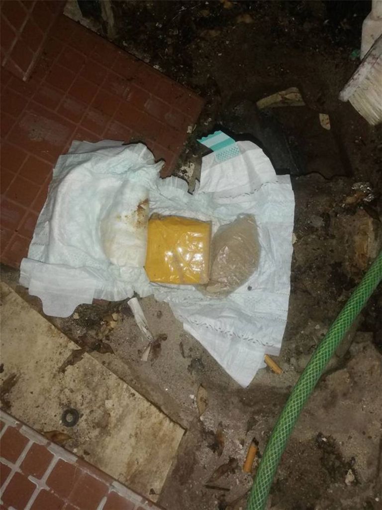 Όπως ανακοίνωσε η αστυνομία, κατασχέθηκαν τρία δέματα με 794 γραμμάρια ηρωίνη, ναρκωτική ουσία που ήταν επιμελώς κρυμμένη σε χρησιμοποιημένη βρεφική πάνα και σε στήριγμα νιπτήρα εξωτερικής τουαλέτας.