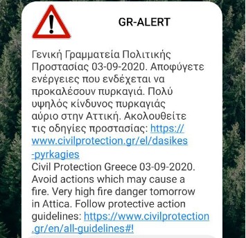 Σε μήνυμα που εστάλη σε κατοίκους της Αττικής, η Γενική Γραμματεία τούς καλεί να αποφύγουν ενέργειες που ενδέχεται να προκαλέσουν πυρκαγιά. «Πολύ υψηλός κίνδυνος πυρκαγιάς αύριο στην Αττική. Ακολουθείτε τις οδηγίες προστασίας» προστίθεται