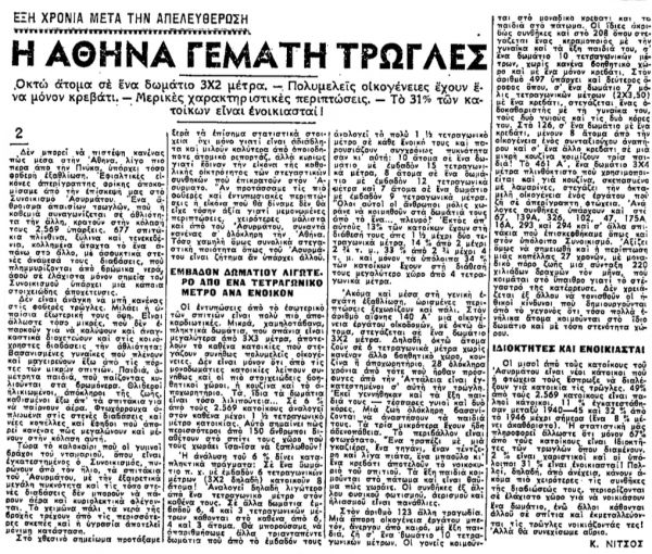 «Στον αριθμό αίφνης 140 Α’ μια οικογένεια εργάτου οικοδομών, με οκτώ άτομα στεγάζεται σε ένα δωμάτιο 3X2 μέτρα. Δηλαδή οκτώ άτομα ζουν σε 6 τετραγωνικά μέτρα, χωρίς κανέναν άλλο βοηθητικό χώρο, κουζίνα ή αποχωρητήριο, 28 ολόκληρα χρόνια από τότε που ήρθαν πρόσφυγες από την Αττάλεια είναι εγκατεστημένοι σ’ αυτή την τρώγλη. Εκεί γεννήθηκαν και τα έξι παιδιά τους – τέσσαρες γυιοί και δυό κόρες. Μια ζωή ολόκληρη βασανίζονται να αναστήσουν τα παιδιά τους. Τα τρία μικρότερα έχουν ήδη αδενοπάθεια. Το περιβάλλον είναι φτωχότατο. Ένα τραπέζι με μια γκαζιέρα, ένα τηγάνι, έναν τέντζερη και λίγα πιάτα, ένα μπαούλο κι ένα κρεβάτι αποτελούν το νοικοκυριό τους σπιτιού. Τα έξη παιδιά κοιμούνται στο πάτωμα και είναι θαύμα πως χωράνε. (…) Στο αριθμό 123 άλλη τραγωδία. Μια άπορη οικογένεια εργάτου μπετόν, άνεργο από καιρό, με έξη παιδιά, ζη σ’ ένα δωμάτιο 10 τετραγωνικών μέτρων. Οι γονείς κοιμούνται στο μοναδικό κρεβάτι και τα παιδιά στο πάτωμα (…) Αξίζει όμως να σημειωθεί και η περίπτωση μιας κοπέλλας 27 χρονών, με μοναδικό πόρο ζωής μια σύνταξη 220 χιλιάδων δραχμών τον μήνα, που κοιμάται στο ύπαιθρο γιατί το στέγαστρο κατέρρευσε. Δεν χρειάζεται εξ άλλου να τονισθούν οι ηθικοί κίνδυνοι που δημιουργούνται από το γεγονός ότι τόσα πολλά ενήλικα άτομα κοιμούνται στο ίδιο δωμάτιο και με τόση στενότητα χώρου»