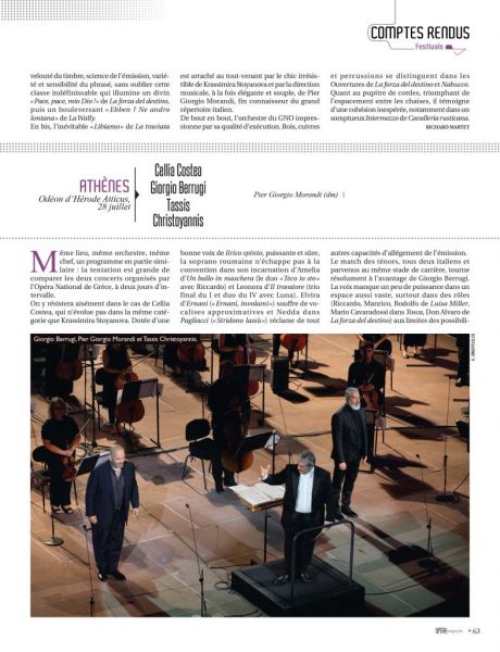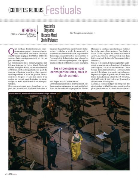 Μια εντυπωσιακή φωτογραφία από το 1ο Γκαλά Όπερας της Εθνικής Λυρικής Σκηνής στο Ηρώδειο κοσμεί το εξώφυλλο του σημαντικότερου περιοδικού όπερας στη Γαλλία. Ο διευθυντής του περιοδικού Richard Martet υπογράφει την πολύ θετική κριτική για τα δύο Γκαλά της ΕΛΣ στο Ηρώδειο τον περασμένο Ιούλιο, ενώ παράλληλα κάνει ρεπορτάζ για τις μελλοντικές καλλιτεχνικές δραστηριότητες της ΕΛΣ.