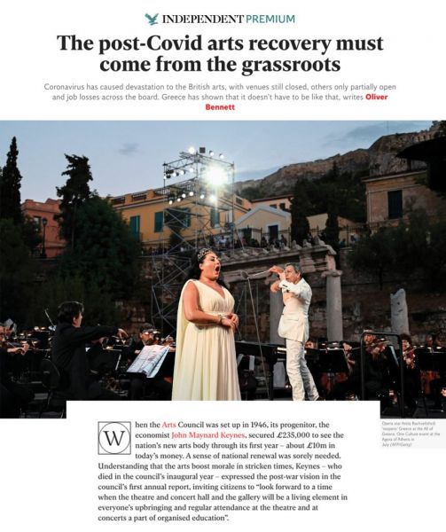 Στο ρεπορτάζ του έγκυρου βρετανικού Independent με τίτλο «Η ανάρρωση των τεχνών μετά τον κορονοϊό θα πρέπει να γίνει εκ βάθρων», ο δημοσιογράφος Oliver Bennett κάνει εκτενή αναφορά στα προβλήματα που προκάλεσε η πανδημία στον χώρο της τέχνης στη Βρετανία, στους τρόπους στήριξης των τεχνών από τις ευρωπαϊκές κυβερνήσεις και μιλάει, μεταξύ άλλων, με τον Καλλιτεχνικό Διευθυντή της Εθνικής Λυρικής Σκηνής Γιώργο Κουμεντάκη. Στον πρόλογο του ρεπορτάζ η εφημερίδα σημειώνει: «Ο κορονοϊός υπήρξε καταστροφικός για τις τέχνες στη Βρετανία, με τους πολιτιστικούς χώρους να παραμένουν κλειστοί, άλλους να ανοίγουν σταδιακά και με ανεργία σε όλους τους τομείς. Η Ελλάδα δείχνει ότι μπορεί να γίνει και αλλιώς».