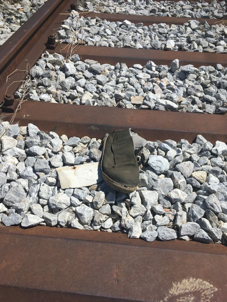 Διασχίζοντας κατά μήκος τις σιδηροδρομικές γραμμές κι ανάμεσα σε τρένα- κουφάρια, τα «αποτυπώματα» των ανθρώπων που πέρασαν από την αφετηρία των εμπορικών συρμών είναι εμφανή: παπούτσια, άδειες κονσέρβες και μπουκάλια με νερό.