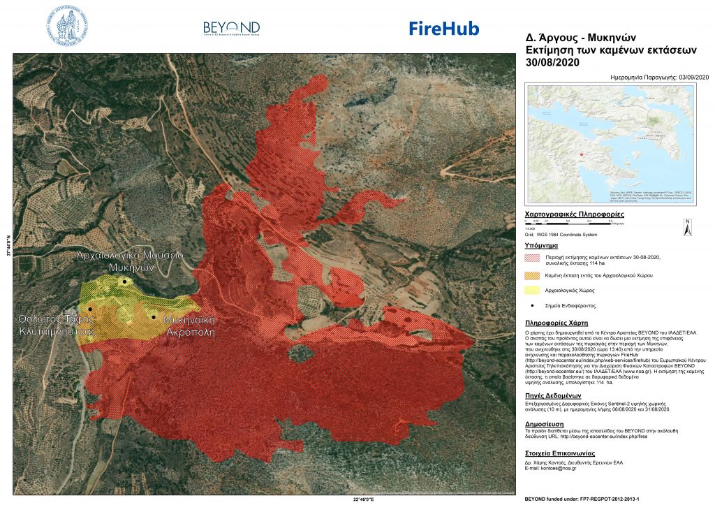 Περισσότερα στοιχεία για τα σημεία που έπληξε η πυρκαγιά που ξέσπασε στις 30 Αυγούστου στον αρχαιολογικό χώρο των Μυκηνών έδωσε σήμερα 7/9 το Κέντρο Επιστημών Παρατήρησης της Γης και Δορυφορικής Τηλεπισκόπησης BEYOND του Ινστιτούτου Αστρονομίας και Αστροφυσικής του Εθνικού Αστεροσκοπείου Αθηνών.