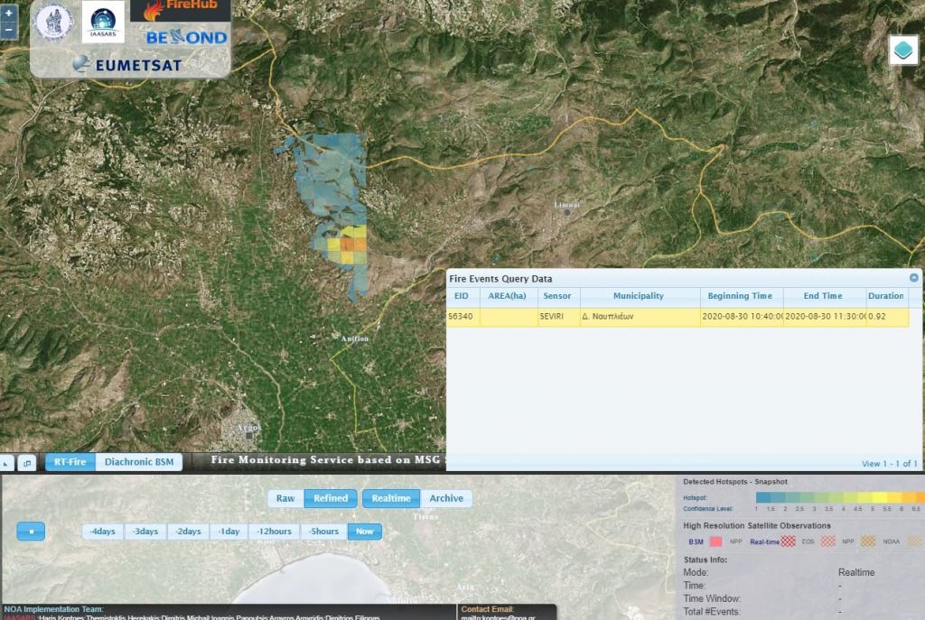 Σύμφωνα με τα στοιχεία των δορυφορικών εικόνων υψηλής ανάλυσης Sentinel-2 (10 m), οι οποίες συλλέχθηκαν πριν (6/08/2020) και μετά (31/08/2020) την πυρκαγιά από τα hubs του Ελληνικού Mirror Site που λειτουργούν στο Κέντρο Αριστείας BEYOND, και οι οποίες επεξεργάστηκαν από την ερευνητική ομάδα FIREHUB, η πυρκαγιά εξαπλώθηκε γρήγορα και έκαψε συνολικά μία έκταση 114 ha (1140 στρεμ.). Αξίζει να σημειωθεί ότι η συγκεκριμένη περιοχή, σύμφωνα με το Διαχρονικό Σύστημα Χαρτογράφησης Πυρκαγιών του κέντρου BEYOND, το οποίο καταγράφει όλες τις πυρκαγιές από το 1984 μέχρι και σήμερα, δεν είχε καεί ποτέ στο πρόσφατο παρελθόν.
