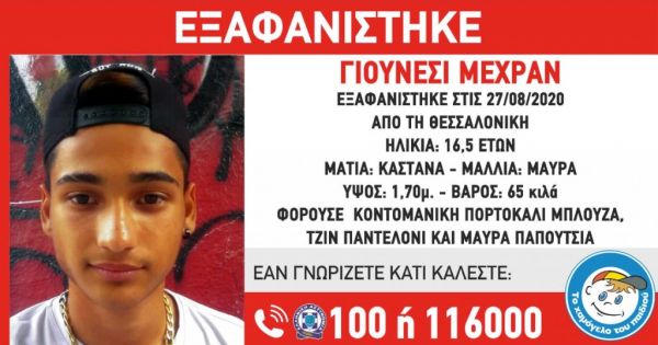 Συναγερμός έχει σημάνει στη Θεσσαλονίκη μετά την εξαφάνιση του 16,5 ετών Γιουνέσι Μεχράν, για τον οποίο έβγαλε ανακοίνωση το «Χαμόγελο του Παιδιού».