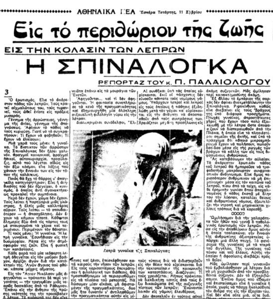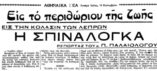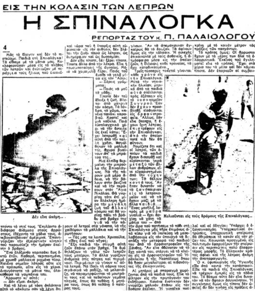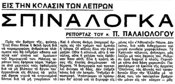 Τον Σεπτέμβριο του 1935, τα «Αθηναικά Νέα» δημοσιεύουν σε συνέχειες την αφήγηση του εμβληματικού χρονικογράφου του 20ου αιώνα, Παύλου Παλαιολόγου στη Σπιναλόγκα, το μικρό νησί που για δεκαετίες αποτέλεσε μία απάνθρωπη «αποθήκη ψυχών».