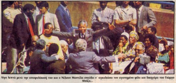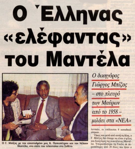 «ΤΑ ΝΕΑ» εξασφάλισαν τότε μια αποκλειστική συνέντευξη του Γιώργου Μπίζου, δικηγόρου και προσωπικού φίλου του Νέλσον Μαντέλα, υπέρχμαχου των ανθρωπίνων δικαιωμάτων και εξέχουσας προσωπικότητας του κινήματος κατά του Απαρτχάιντ