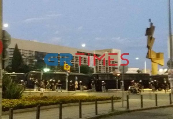 Φραγμό από κλούβες των ΜΑΤ μπροστά από το ΑΠΘ έχει στήσει η αστυνομία, παρεμποδίζοντας την πρόσβαση των διαδηλωτών κατά την ολοκλήρωση της πορείας.