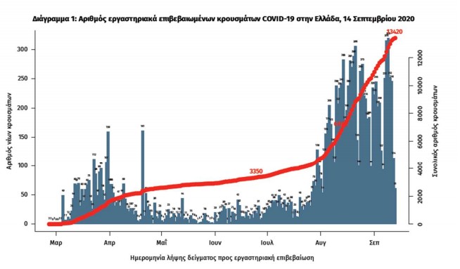 Έτσι, ο συνολικός αριθμός των κρουσμάτων είναι 13.420, εκ των οποίων το 55.4% άνδρες, ενώ 2.419 (18.0%) θεωρούνται σχετιζόμενα με ταξίδι από το εξωτερικό και 5.789 (43.1%) είναι σχετιζόμενα με ήδη γνωστό κρούσμα.