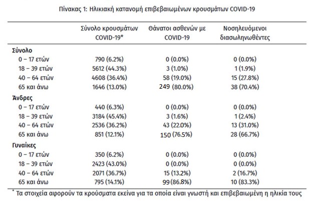 Η μέση ηλικία των κρουσμάτων είναι 39 έτη (εύρος 0 έως 102 ετών), ενώ η μέση ηλικία των θανάτων είναι 78 έτη (εύρος 35 έως 102 ετών). Η ηλικιακή κατανομή των (α) συνολικών κρουσμάτων, (β) των περιστατικών που κατέληξαν σε θάνατο και (γ) των ασθενών που νοσηλεύονται διασωληνωμένοι, είναι η ακόλουθη: