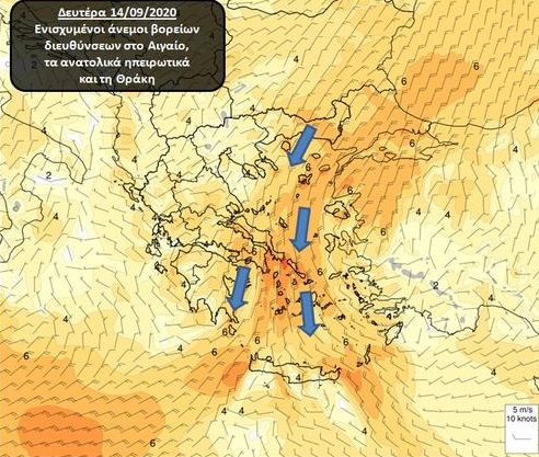 Οι άνεμοι θα πνέουν στο Αιγαίο από βόρειες διευθύνσεις με εντάσεις έως 7 μποφόρ και έως το πρωί τοπικά στα βόρεια πελάγη 8 μποφόρ. Στο Ιόνιο θα επικρατούν άνεμοι ανατολικών διευθύνσεων με εντάσεις έως 5 και τοπικά 6 μποφόρ. Στην Αττική θα επικρατήσει ηλιοφάνεια με λίγες μόνο τοπικές νεφώσεις. Οι άνεμοι θα πνέουν βόρειοι βορειοανατολικοί με εντάσεις έως 5 μποφόρ και στα ανατολικά 6 με 7 μποφόρ. Η θερμοκρασία θα κυμανθεί από 20 έως 31 βαθμούς.