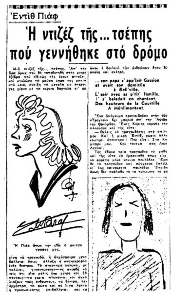 Γράφει ο Ταχυδρόμος της 1ης Σεπτεμβρίου 1956 για την Εντίθ Πιάφ: «Σε κείνον που δεν γνωρίζει το παρελθόν της, η Γαλλίδα βεντέττα του τραγουδιού μπορεί να φανή αδικαιολόγητα μελαγχολική: ‘Εχει πλούτη πολλά, πιστούς φίλους σαν τον Κοκτώ, ή την Μάρλεν Ντήτριχ, ένα κοινό που την αποθεώνει…Κι όμως.»