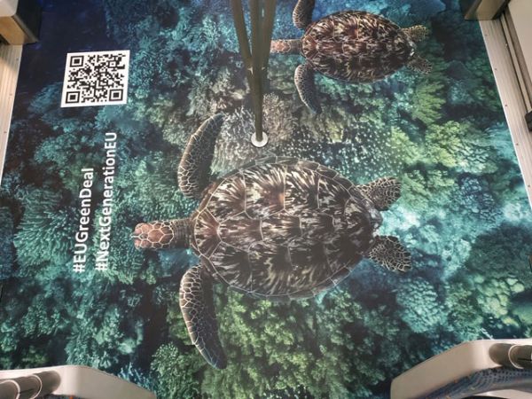 Οι αφίσες που ντύνουν το εσωτερικό του μετρό διαθέτουν πάνω τους ειδικά QR codes που λειτουργούν ως σύνδεσμοι μεταφέροντας όσους τα σκανάρουν με το κινητό τους στο σχετικό σύντομο βίντεο. Κεντρικό πρόσωπο της καμπάνιας είναι ο γνωστός παρουσιαστής Φώτης Σεργουλόπουλος, ο οποίος ξεναγεί τους επιβάτες στους βασικούς «σταθμούς» του #EUGreenDeal.