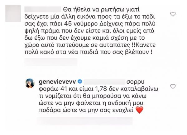 Η Ζενεβιέβ Μαζαρί απάντησε με τον δικό της μοναδικό τρόπο «Σόρι, φοράω 41 και είμαι 1,78 δεν καταλαβαίνω τι νομίζετε ότι θα μπορούσα να κάνω, ώστε να μην φαίνεται η ανδρική μου ποδάρα, ώστε να μην σας ενοχλεί».