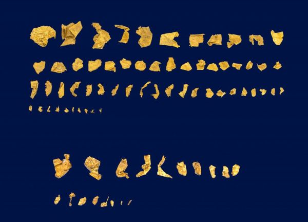 Ο εντοπισμός ενός μικρού, χρυσού ελάσματος, που αποκαλύφθηκε μετά από βροχή, προκάλεσε την έρευνα κάτω από αυτό το λίθινο στρώμα του βωμού, όπου επιφυλάχθηκε μία έκπληξη. Στο κέντρο του υποκείμενου στρώματος βρέθηκε τμήμα καμένου ξύλου, στο οποίο ήταν είτε προσκολλημένα, είτε διεσπαρμένα γύρω από αυτό, πλήθος από μικρά, χρυσά ελάσματα, συνολικά περί τα 90. Η εύρεση αυτού του συνόλου, δεν μπορεί να ερμηνευθεί διαφορετικά από την ύπαρξη ενός ξύλινου ειδώλου, ενδεδυμένου με λεπτά φύλλα χρυσού. Αντίστοιχα είδωλα με χρυσή επένδυση γνωρίζουμε από ελεφάντινα ειδώλια των Αρχανών και του Παλαικάστρου.