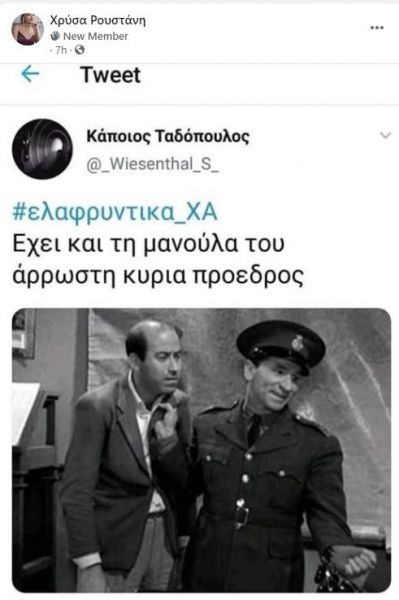 «Έχει και τη μανούλα του άρρωστη κυρία πρόεδρος» γράφει ένας άλλος, το οποίο παραπέμπει στη γνωστή ατάκα από την ελληνική ταινία «Ο Ηλίας του 16ου».