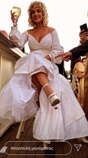 Γι’ αυτή την ιδιαίτερη ημέρα, η γνωστή τραγουδίστρια διάλεξε ένα ρομαντικό λευκό νυφικό με πέπλο, δημιουργία της Σήλιας Κριθαριώτη.