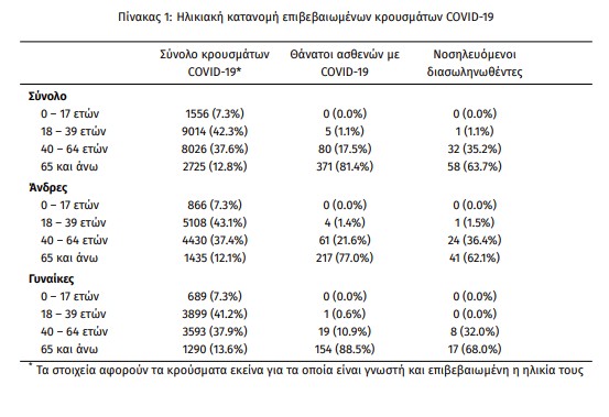Τέλος, έχουμε 7 ακόμα καταγεγραμμένους θανάτους και 456 θανάτους συνολικά στη χώρα. 174 (38.2%) γυναίκες και οι υπόλοιποι άνδρες. Η διάμεση ηλικία των θανόντων συμπολιτών μας ήταν τα 79 έτη και το 96.5% είχε κάποιο υποκείμενο νόσημα ή/και ηλικία 70 ετών και άνω.