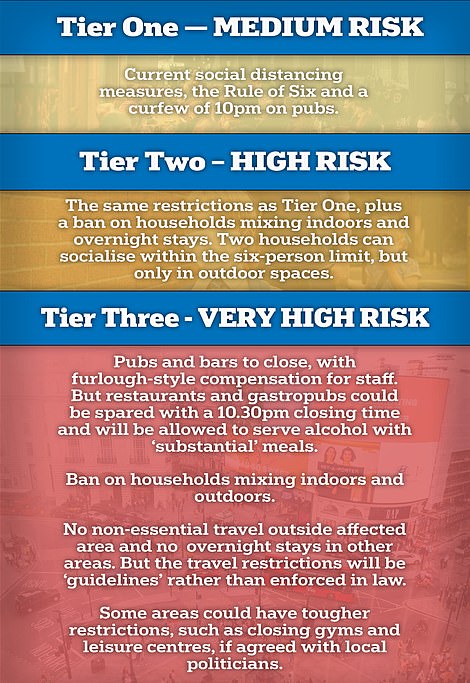 Οι περιοχές της χώρας χωρίζονται σε «μεσαίου», «υψηλού» και «πολύ υψηλού» επιπέδου κινδύνου. Η κλιμάκωση δεν περιλαμβάνει «χαμηλό επίπεδο», γεγονός ενδεικτικό της κατάστασης που επικρατεί με την πανδημία στη Βρετανία.