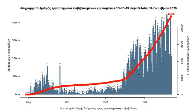 Έτσι, ο συνολικός αριθμός των κρουσμάτων είναι 23.495, εκ των οποίων το 55.5% άνδρες, ενώ 3.404 (14.5%) θεωρούνται σχετιζόμενα με ταξίδι από το εξωτερικό και 9.525 (40.5%) είναι σχετιζόμενα με ήδη γνωστό κρούσμα.