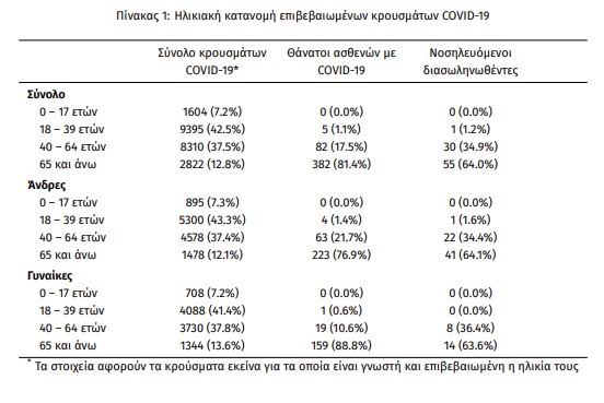 Τέλος, έχουμε 7 ακόμα καταγεγραμμένους θανάτους και 469 θανάτους συνολικά στη χώρα. 179 (38.2%) γυναίκες και οι υπόλοιποι άνδρες. Η διάμεση ηλικία των θανόντων συμπολιτών μας ήταν τα 79 έτη και το 96.6% είχε κάποιο υποκείμενο νόσημα ή/και ηλικία 70 ετών και άνω.