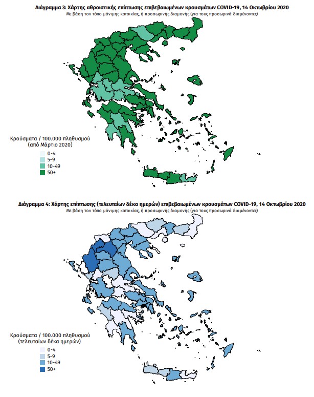 Ο χάρτης αποτυπώνει τη γεωγραφική κατανομή των συνολικών κρουσμάτων COVID-19 (από την αρχή της επιδημίας) ανά Περιφερειακή Ενότητα της χώρας, με βάση την δηλωθείσα διεύθυνση μόνιμης κατοικίας του ασθενούς, ή τη διεύθυνση προσωρινής διαμονής για τους τουρίστες και άλλους προσωρινά διαμένοντες στην Ελλάδα. Συμπεριλαμβάνονται τόσο κρούσματα με ιστορικό ταξιδίου (“εισαγόμενα”) όσο και κρούσματα με πιθανή εγχώρια μετάδοση.