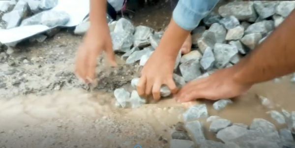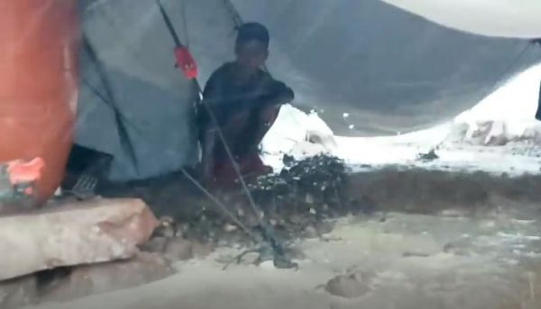 Με γυμνά χέρια και ξυπόλητοι -ή στην καλύτερη περίπτωση φορώντας παντόφλες- προσπαθούν να σκάψουν αυλάκια ώστε να αποτρέψουν την εισροή της βροχής στις σκηνές τους.