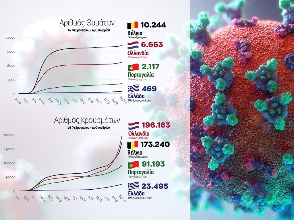 Συγκεκριμένα στο γράφημα με τον αριθμό των θυμάτων η Ελλάδα είναι τελευταία με 469 θύματα. Πρώτο έρχεται το Βέλγιο με 10.244 νεκρούς και ακολουθούν Ολλανδία και Πορτογαλία.