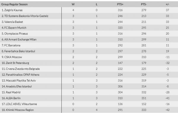 3 νίκες και 1 ήττα μετρούν πλέον οι «ερυθρόλευκοι», με τη Ζαλγκίρις να είναι η μοναδική ομάδα που βρίσκεται από πάνω τους. Επόμενο ματς του Ολυμπιακού είναι αυτό με την Μπάγερν στο Μόναχο την ερχόμενη Παρασκευή (23/10, 21:30).