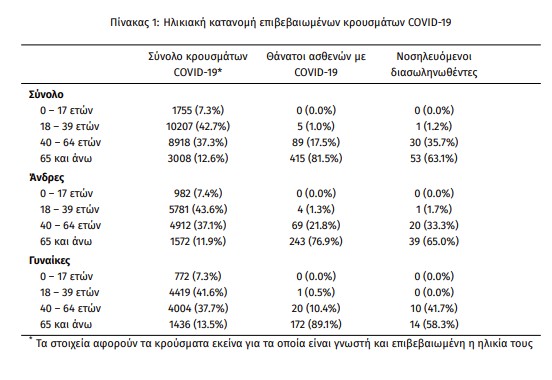 Η μέση ηλικία των κρουσμάτων είναι 39 έτη (εύρος 0 έως 102 ετών), ενώ η μέση ηλικία των θανάτων είναι 79 έτη (εύρος 25 έως 102 ετών). Η ηλικιακή κατανομή των (α) συνολικών κρουσμάτων, (β) των περιστατικών που κατέληξαν σε θάνατο και (γ) των ασθενών που νοσηλεύονται διασωληνωμένοι, είναι η ακόλουθη: