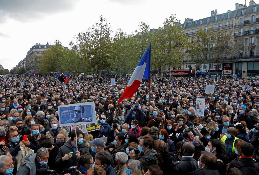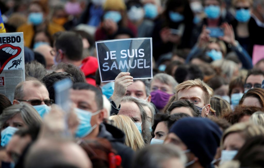 Κρατώντας πλακάτ που έγραφαν «Όχι στον ολοκληρωτισμό της σκέψης» και «Είμαι καθηγητής» τίμησαν την μνήμη του 47χρονου καθηγητή, ο οποίος δολοφονήθηκε, έξω από το σχολείο όπου δίδασκε, επειδή είχε δείξει στους μαθητές του σατιρικά σκίτσα του Μωάμεθ, διδάσκοντας την ελευθερία λόγου.