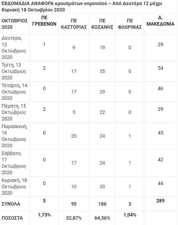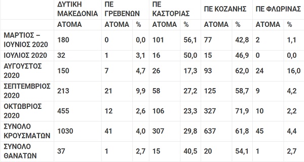 Συνοπτικά, η εξέλιξη των επιβεβαιωμένων κρουσμάτων αλλά και θανάτων από τον κορωναϊό στη Δυτική Μακεδονία, από την έναρξη της πανδημίας μέχρι και χθες Κυριακή 18 Οκτωβρίου 2020, σε αριθμούς και ποσοστά έχει ως εξής: