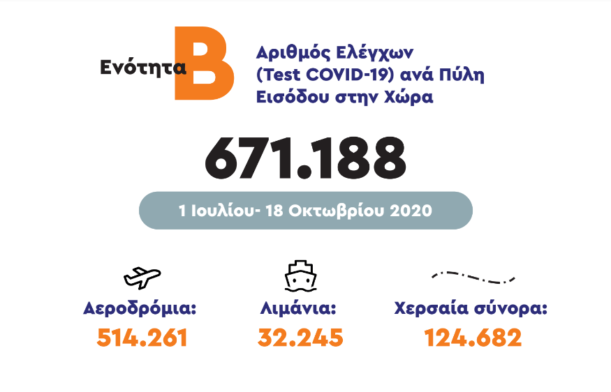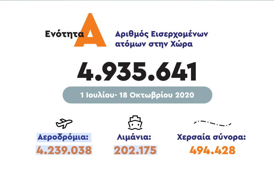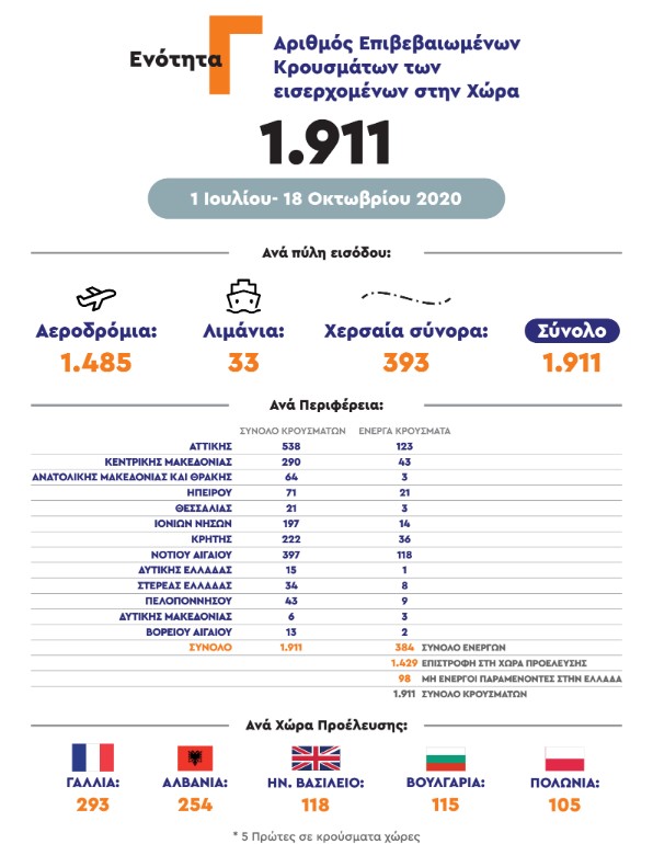 Σε ό,τι αφορά στα εισερχόμενα κρούσματα, από την 1η Ιουλίου που άνοιξαν τα σύνορα για να υποδεχτεί η χώρα τους πρώτους τουρίστες έως και σήμερα, έχουν εισέλθει στην Ελλάδα σχεδόν 5 εκατ. άνθρωποι, εκ των οποίων μόλις 1.911 βρέθηκαν θετικά στον κοροναϊό.