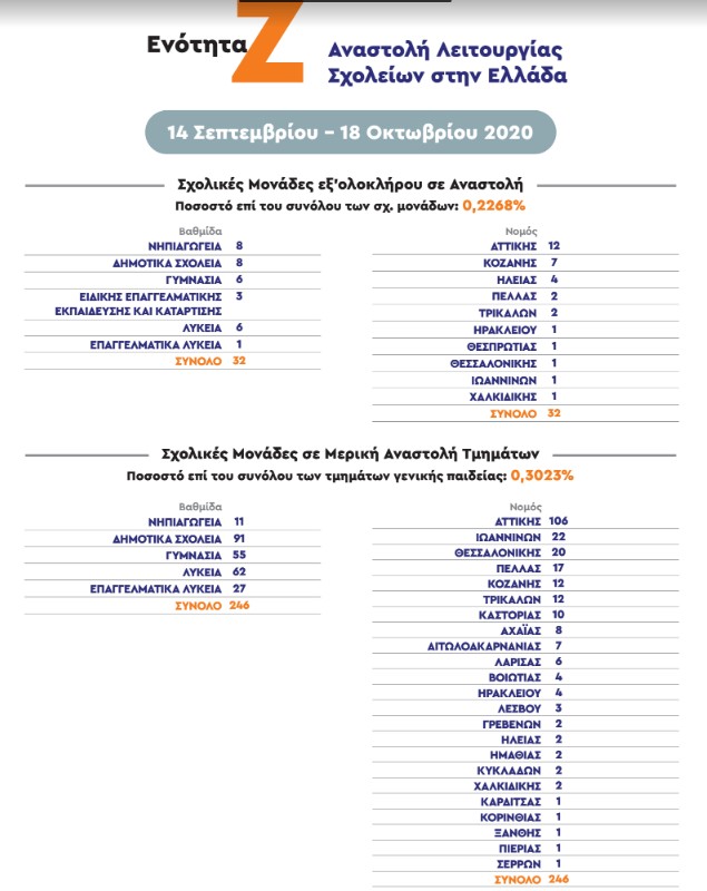 Ακόμα, έχει ανασταλεί η λειτουργία 246 τμημάτων, εκ των οποίων τα 106 στην Αττική και 22 σε Ιωάννινα.